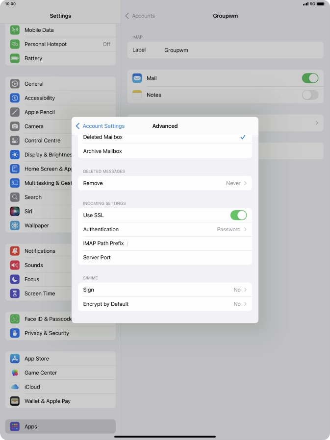 Press the required email account and follow the instructions on the screen to select settings for the specific account.