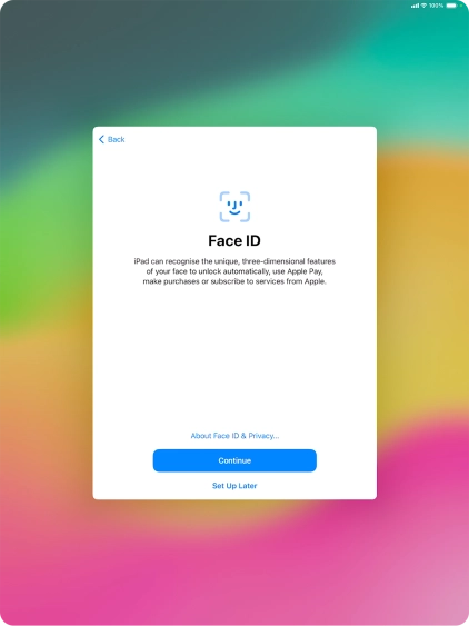 Follow the instructions on the screen to turn on use of Face ID or press Set Up Later.
