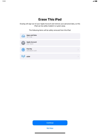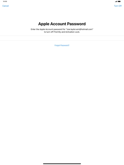 Key in the password for your Apple ID and press Turn Off. Wait a moment while the factory default settings are restored. Follow the instructions on the screen to set up your tablet and prepare it for use.