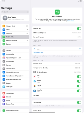 Press the indicator next to "Mobile Data" to turn the function on or off.