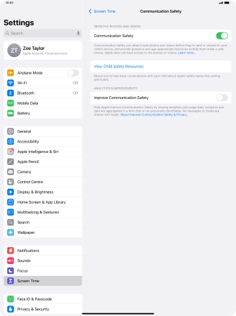 Communication Safety detects sensitive content in pictures and videos sent from and received on the selected Apple devices and offers guidance and warnings about this. This feature can be used when setting up Screen Time for your family group.
