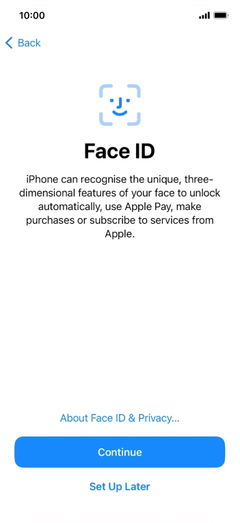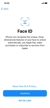 Follow the instructions on the screen to turn on use of Face ID or press Set Up Later.