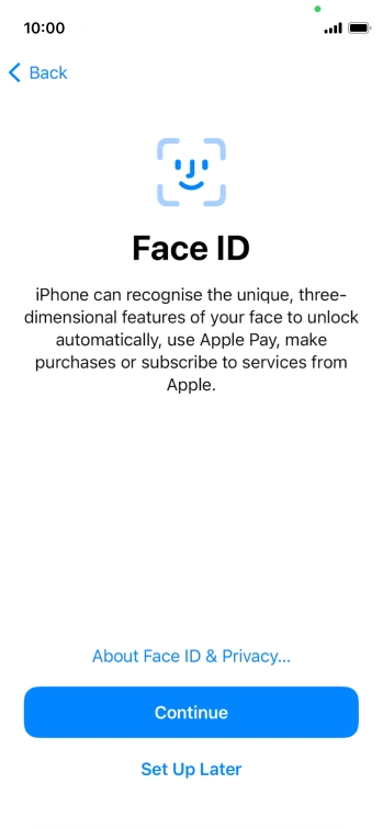 Follow the instructions on the screen to turn on use of Face ID or press Set Up Later.