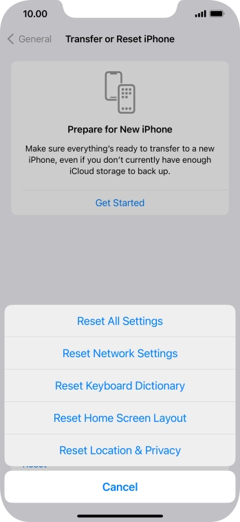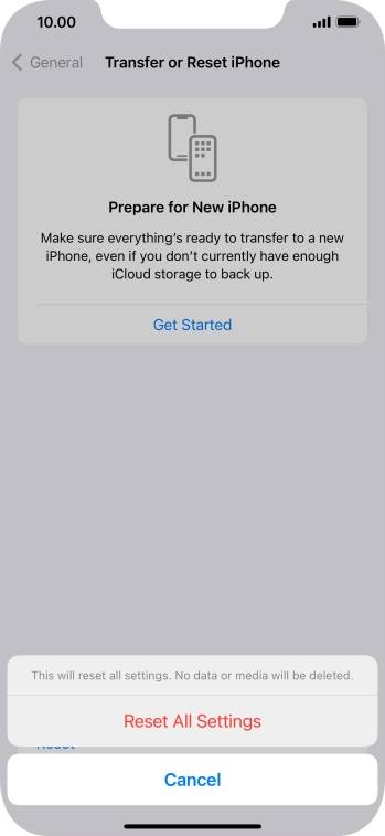 Press Reset All Settings. Wait a moment while the factory default settings are restored. Follow the instructions on the screen to set up your phone and prepare it for use.