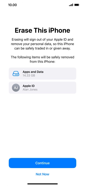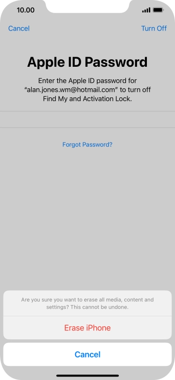 Key in the password for your Apple ID and press Erase iPhone. Wait a moment while the factory default settings are restored. Follow the instructions on the screen to set up your phone and prepare it for use.