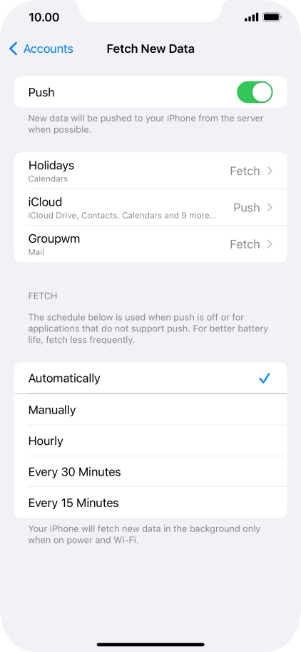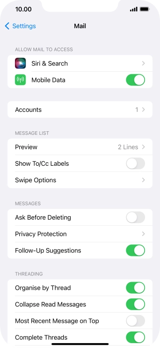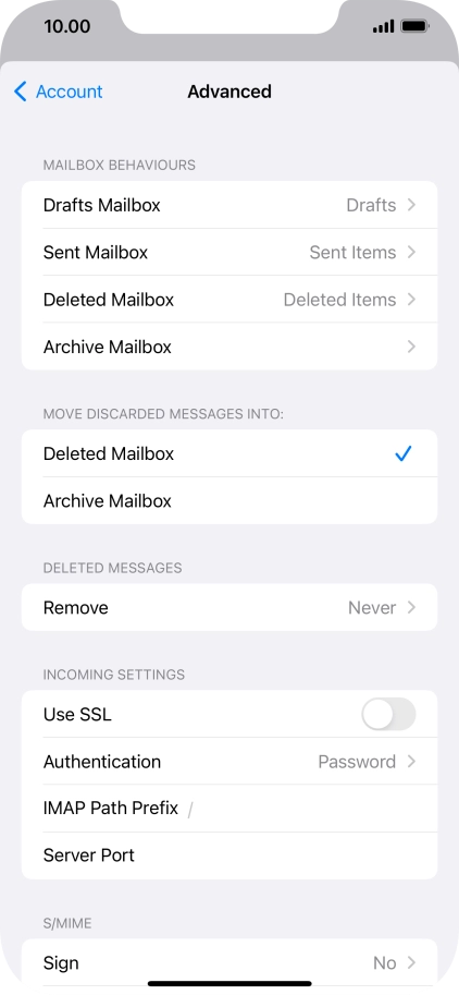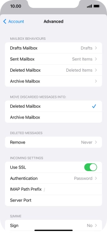 Press the required email account and follow the instructions on the screen to select settings for the specific account.