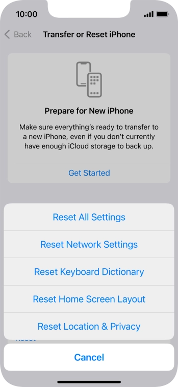 Press Reset All Settings. Wait a moment while the factory default settings are restored. Follow the instructions on the screen to set up your phone and prepare it for use.