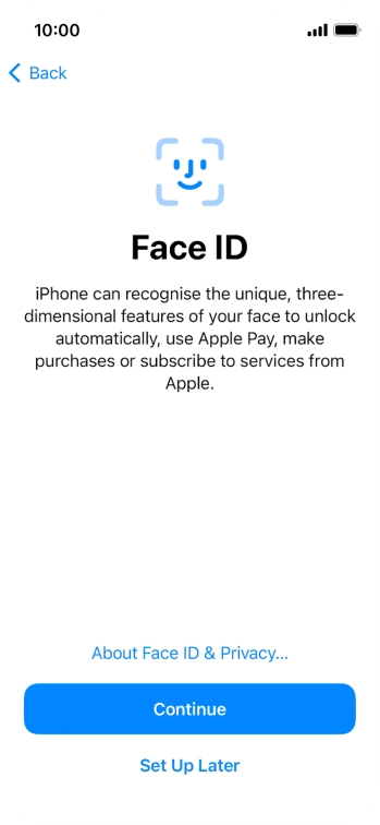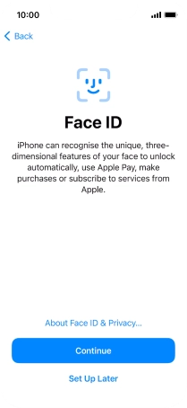 Follow the instructions on the screen to turn on use of Face ID or press Set Up Later.