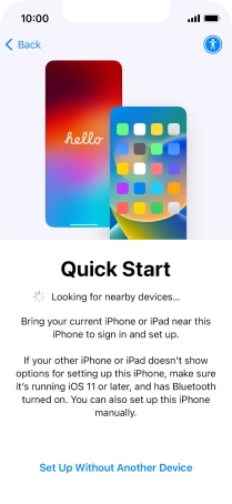 Follow the instructions on the screen to transfer content from another device running iOS 11 or later or press Set Up Without Another Device.