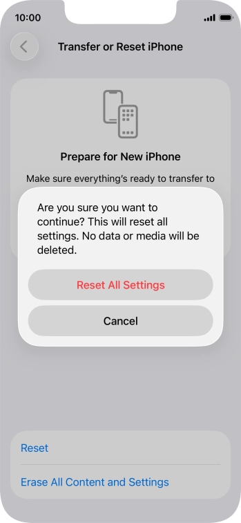 Press Reset All Settings. Wait a moment while the factory default settings are restored. Follow the instructions on the screen to set up your phone and prepare it for use.