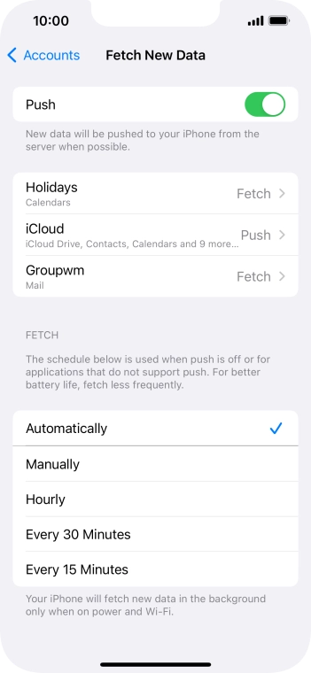Press the required email account and follow the instructions on the screen to select settings for the specific account.
