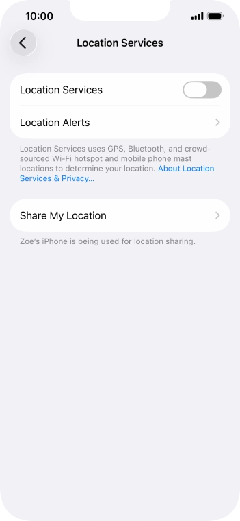 Press the indicator next to "Location Services" to turn the function on or off.