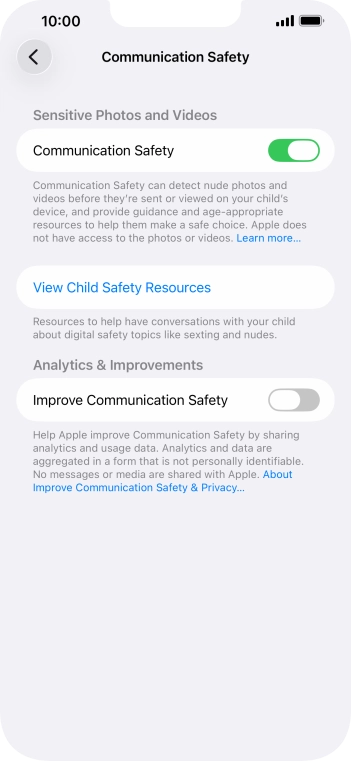 Communication Safety detects sensitive content in pictures and videos sent from and received on the selected Apple devices and offers guidance and warnings about this. This feature can be used when setting up Screen Time for your family group.