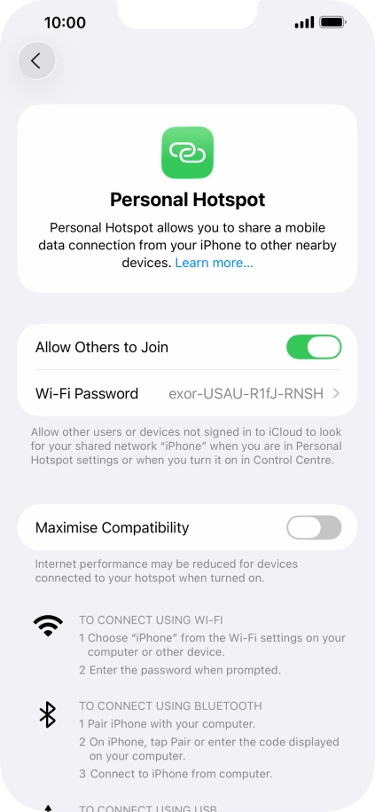 To use your phone as a personal hotspot, you need to turn on the function and establish a connection from the other device to your phone's hotspot.