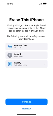 Key in the password for your Apple ID and press Erase iPhone. Wait a moment while the factory default settings are restored. Follow the instructions on the screen to set up your phone and prepare it for use.