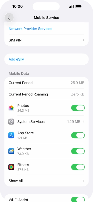 Press the indicator next to "Mobile Data" to turn the function on or off.