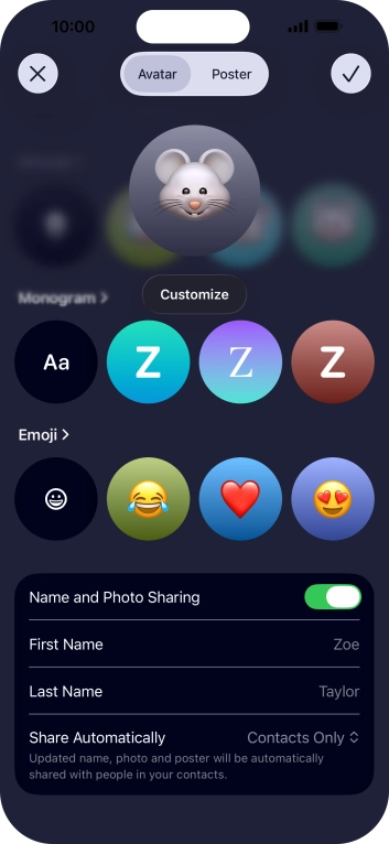 Press the name fields and follow the instructions on the screen to edit your name on the Contact Poster.