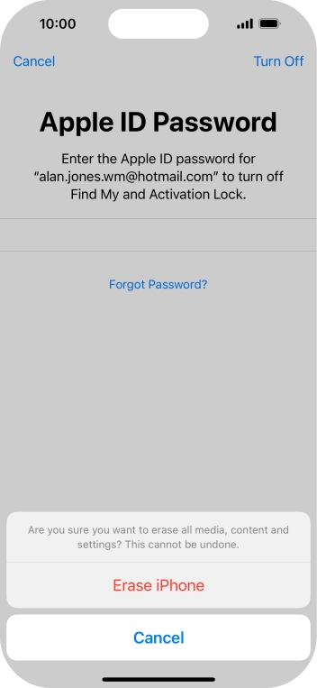 Key in the password for your Apple ID and press Erase iPhone. Wait a moment while the factory default settings are restored. Follow the instructions on the screen to set up your phone and prepare it for use.