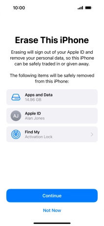 Key in the password for your Apple ID and press Erase iPhone. Wait a moment while the factory default settings are restored. Follow the instructions on the screen to set up your phone and prepare it for use.
