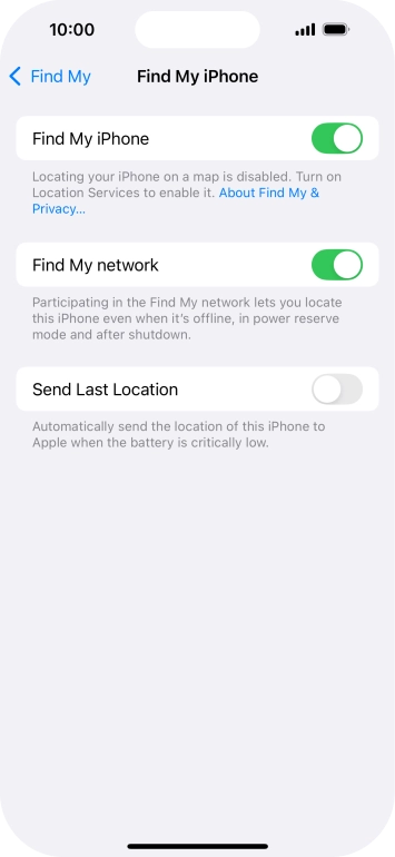 Select settings for Find My iPhone