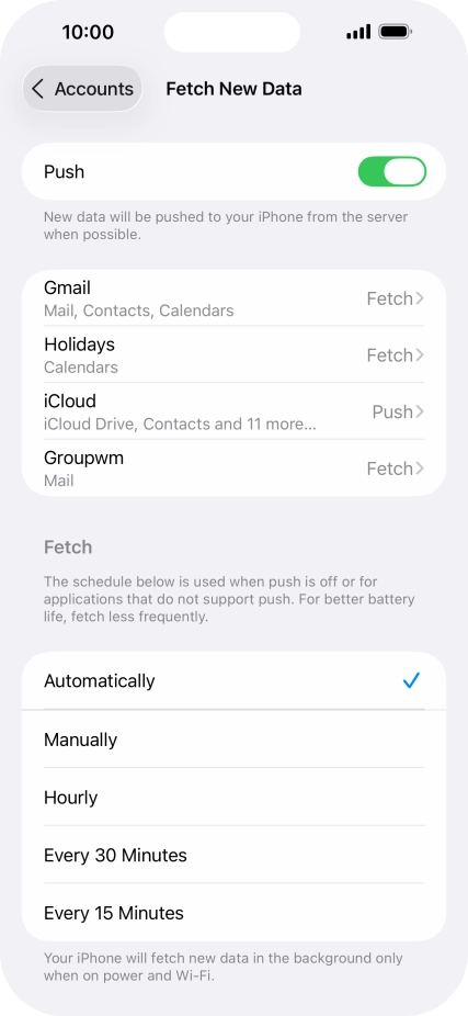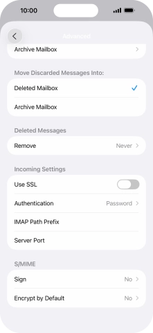 Press the required email account and follow the instructions on the screen to select settings for the specific account.