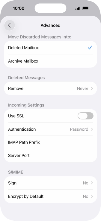Press the required email account and follow the instructions on the screen to select settings for the specific account.