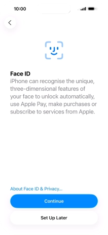 Follow the instructions on the screen to turn on use of Face ID or press Set Up Later.