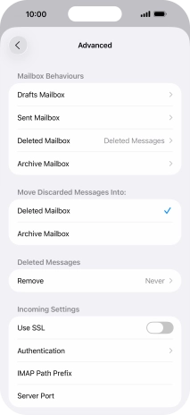 Press the required email account and follow the instructions on the screen to select settings for the specific account.