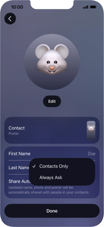Press the name fields and follow the instructions on the screen to edit your name on the Contact Poster.