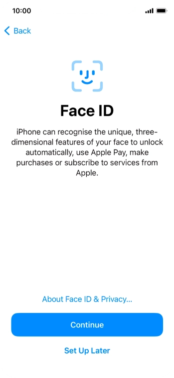 Follow the instructions on the screen to turn on use of Face ID or press Set Up Later.