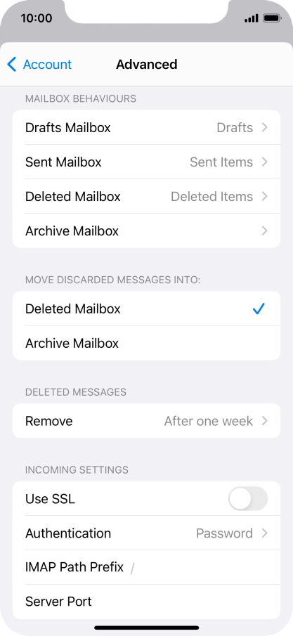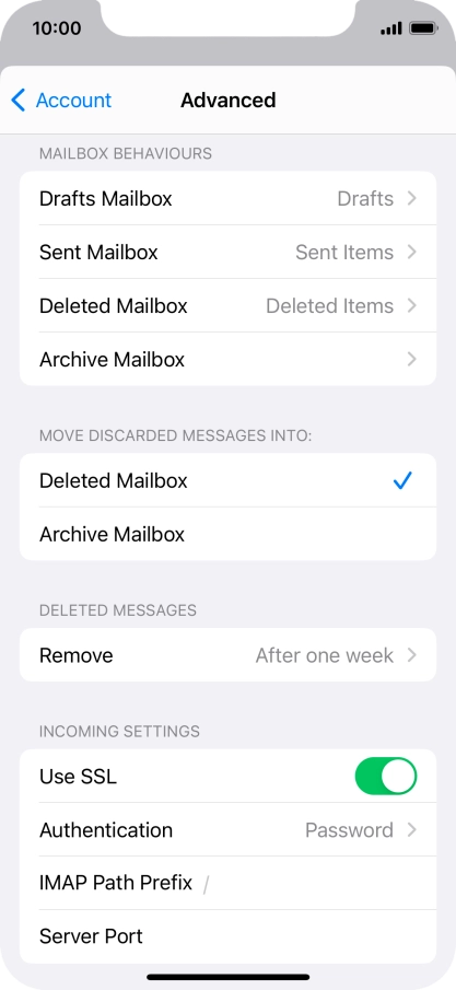 Press the required email account and follow the instructions on the screen to select settings for the specific account.
