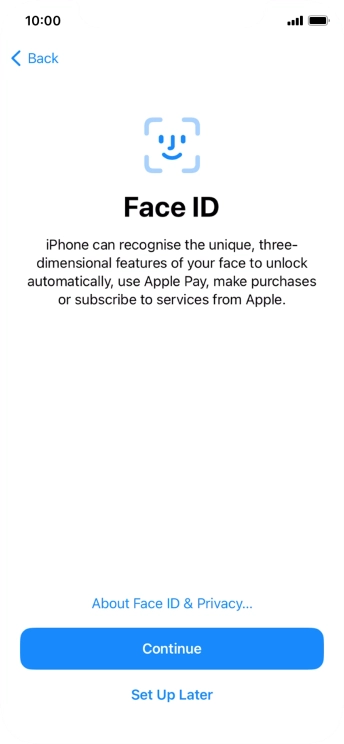 Follow the instructions on the screen to turn on use of Face ID or press Set Up Later.