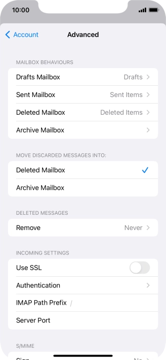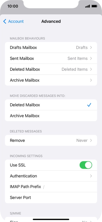 Press the required email account and follow the instructions on the screen to select settings for the specific account.