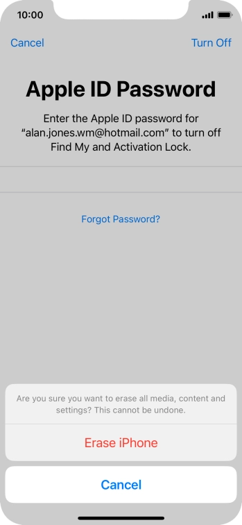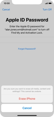 Key in the password for your Apple ID and press Erase iPhone. Wait a moment while the factory default settings are restored. Follow the instructions on the screen to set up your phone and prepare it for use.