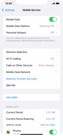 Press the indicator next to "Mobile Data" to turn the function on or off.