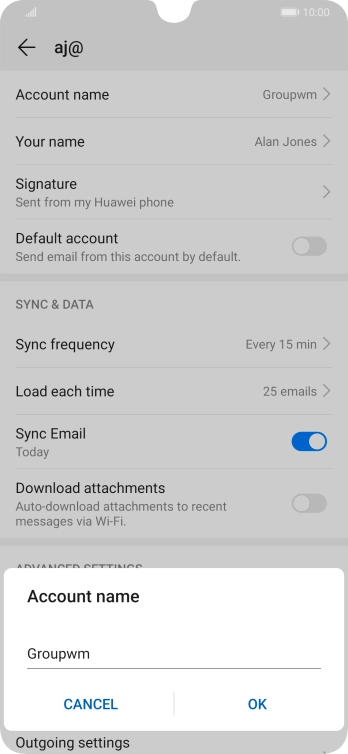 Press the field below "SMTP server" and key in the name of your email provider's outgoing server.