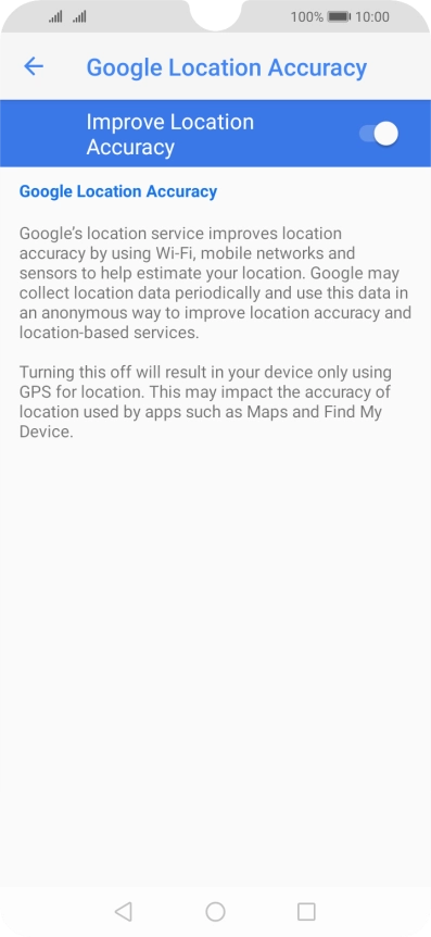 If you press the indicator next to "Improve Location Accuracy" to turn off the function, your phone can find your exact position using the GPS satellites but it may take longer as there is no access to supplementary information from the mobile network or nearby Wi-Fi networks.