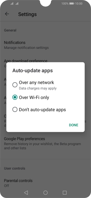 To turn on automatic update of apps using Wi-Fi, press Over Wi-Fi only.