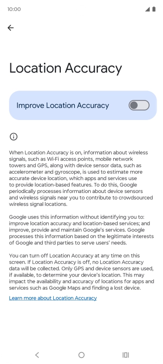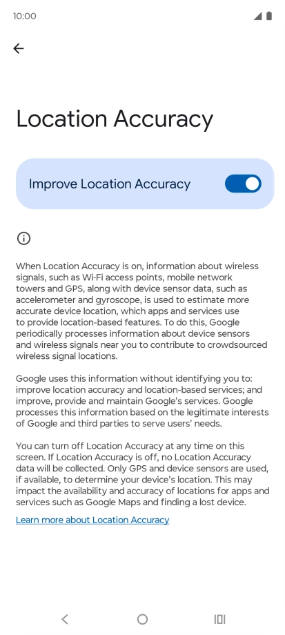 If you press the indicator next to "Improve Location Accuracy" to turn off the function, your phone can find your exact position using the GPS satellites but it may take longer as there is no access to supplementary information from the mobile network or nearby Wi-Fi networks.