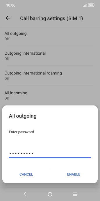 Key in your barring password and press ENABLE. The default barring password is 0000.