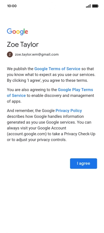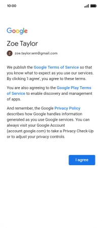 Press I agree and follow the instructions on the screen to select settings for your Google account.