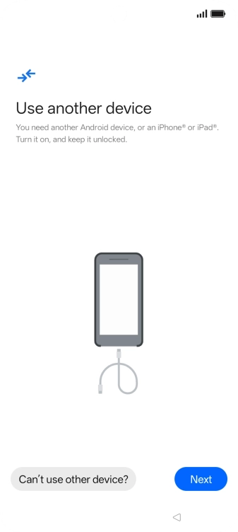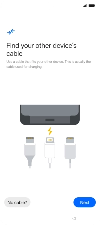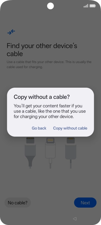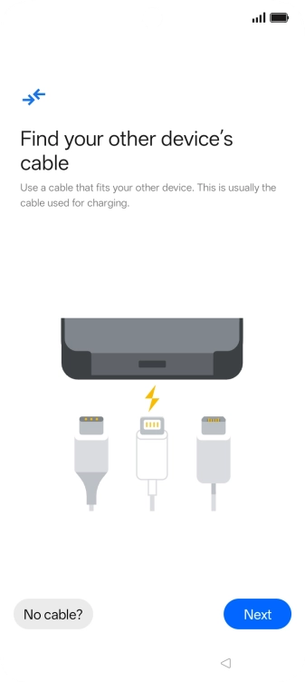 If you have a cable which can connect the two phones, insert the cable and follow the instructions on the screen to transfer content to your phone. If you don’t have a cable, press No cable?.