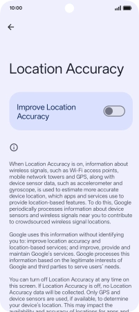 If you press the indicator next to "Improve Location Accuracy" to turn off the function, your phone can find your exact position using the GPS satellites but it may take longer as there is no access to supplementary information from the mobile network or nearby Wi-Fi networks.