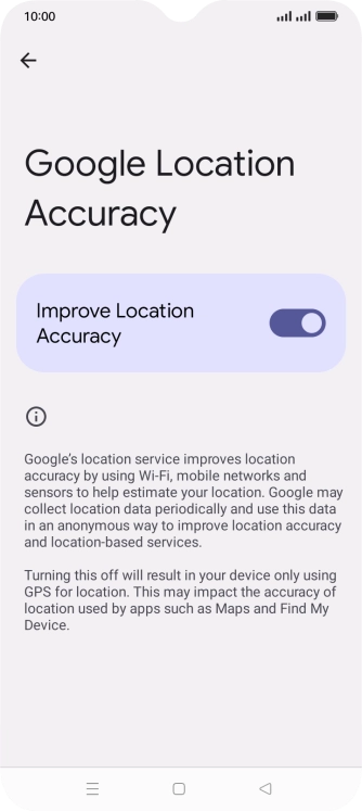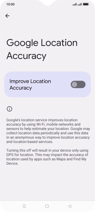 If you press the indicator next to "Improve Location Accuracy" to turn off the function, your phone can find your exact position using the GPS satellites but it may take longer as there is no access to supplementary information from the mobile network or nearby Wi-Fi networks.