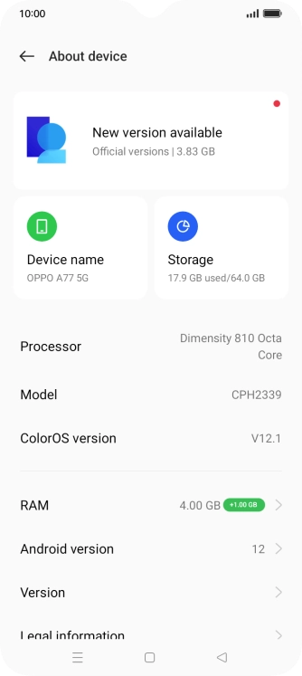 Press ColorOS version. If a new software version is available, it's displayed. Follow the instructions on the screen to update the phone software.