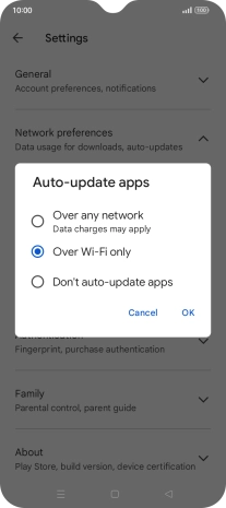 To turn on automatic update of apps using Wi-Fi, press Over Wi-Fi only.