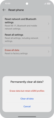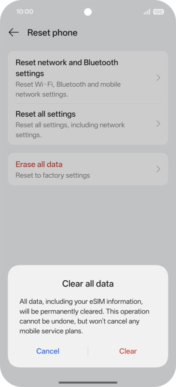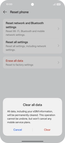 Press Clear. Wait a moment while the factory default settings are restored. Follow the instructions on the screen to set up your phone and prepare it for use.