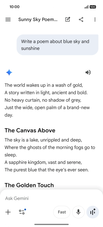 You can use Gemini to generate text, create various creative content and answer your questions in an informative way. Here you can see some examples of Gemini usage. To use most of the Gemini functions, you need to activate your Google account on your phone and set up your phone for internet.