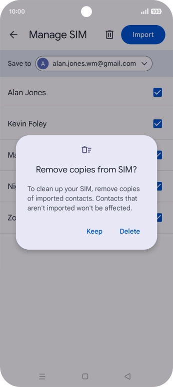 If you want to keep the copied contacts on your SIM, press Keep.