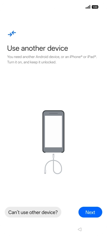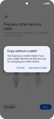 If you have a cable which can connect the two phones, insert the cable and follow the instructions on the screen to transfer content to your phone. If you don’t have a cable, press No cable?.